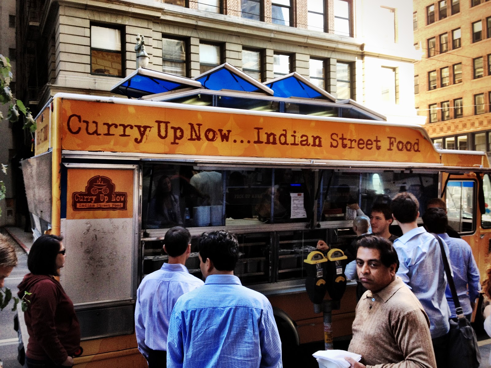 Today, I met my friend Tara for lunch, and since she works in the Financial District, we decided to check out one of the most popular food trucks, Curry Up Now, which specializes in Indian Street Food. The key with food trucks is preparing the food in convenient, on-the-go style options. The folks at Curry Up Now solved this by putting traditional Indian dishes in a tortilla and wrapping them up into a delicious burrito. We both got the Chicken Tikka Masala (with organic chicken breast from Fulton Valley Farms), and I also got a thick Mango Lassi to help wash it down and calm the spiciness of the burrito. (And yes, it really was that bright).