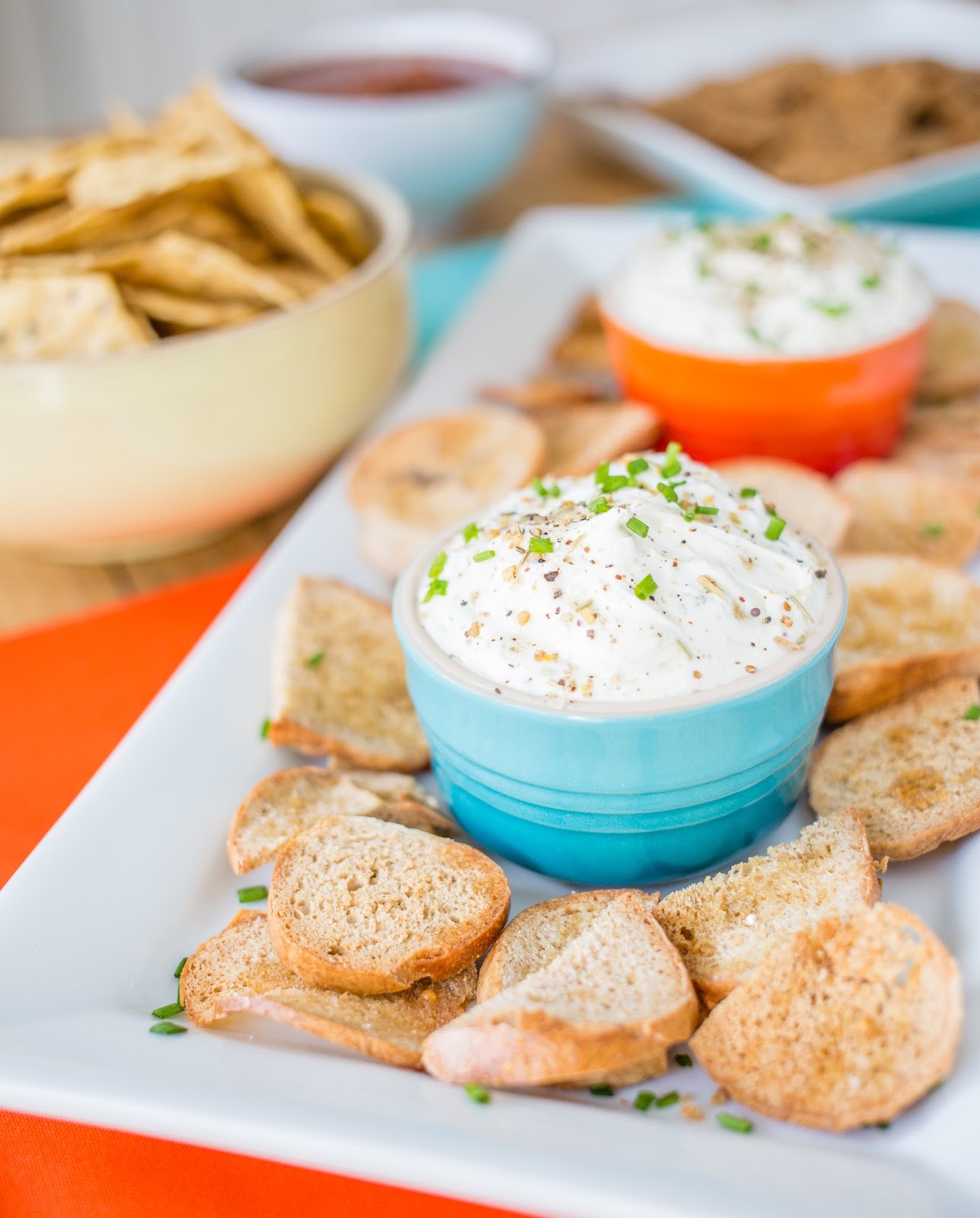 When ready to serve, sprinkle with a little more bagel seasoning and snipped chives and serve with the bagel chips. This would make a great addition to your Super Bowl spread! (Bonus points for ramekins matching the two teams colors). Would also be great for a brunch appetizer, or, as I said… a schmear for actual bagels. And if this doesn’t sound like your thing, but you’d still like to make a dip for the big game, I have plenty of other dip ideas on the blog… just search “dips” in the search feature in the top left hand corner of this page or in the recipe section of the blog.
