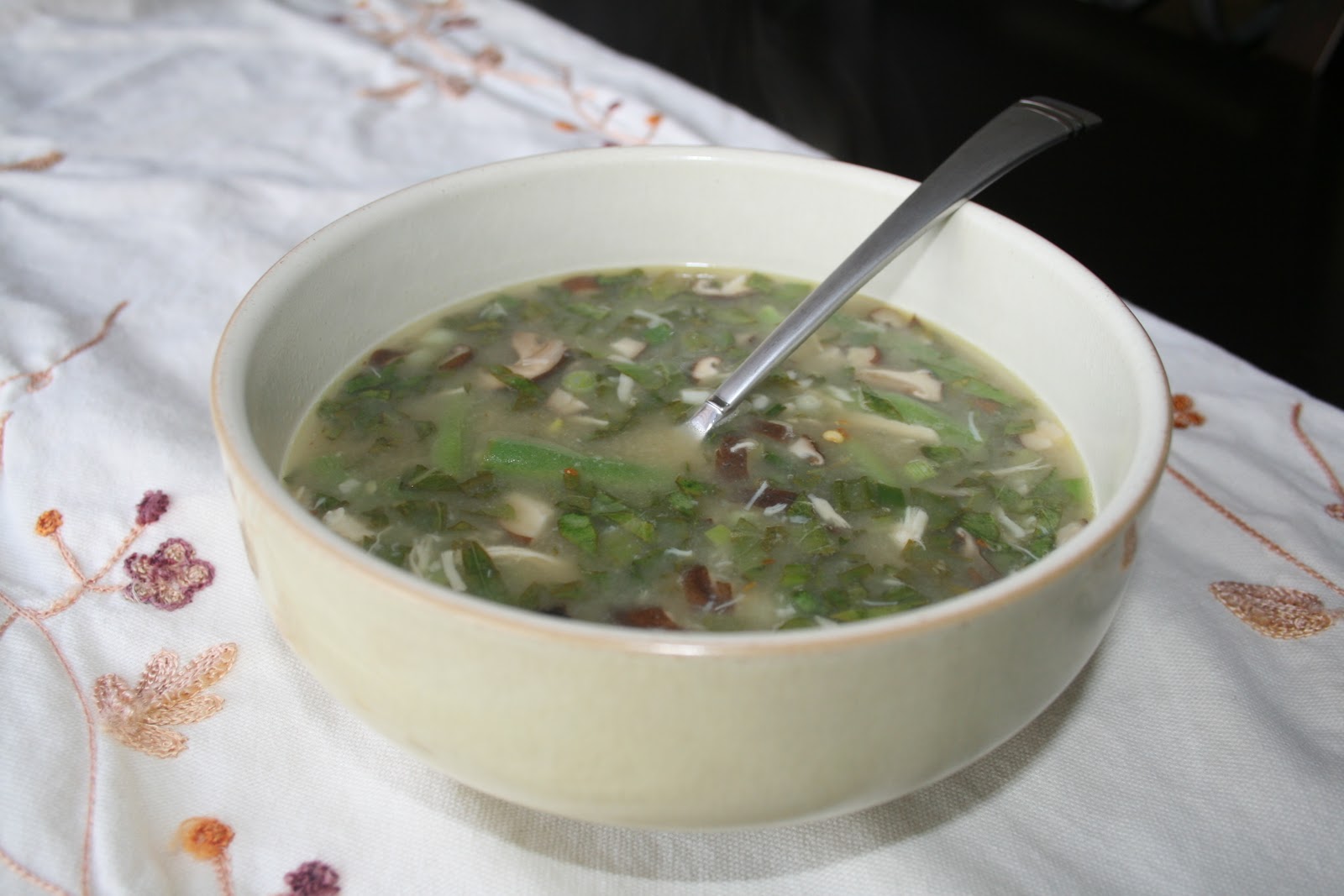 First, you’ll need some fresh herbs and vegetables. I used green beans, green onions, garlic, ginger, mushrooms, basil and mint but you could add other things like carrots, celery, cabbage, cilantro or whatever you have on hand. And chicken of course, though this isn’t pictured. (Hey, I’m still getting used to taking photos while I’m cooking…obviously I haven’t perfected the technique yet).