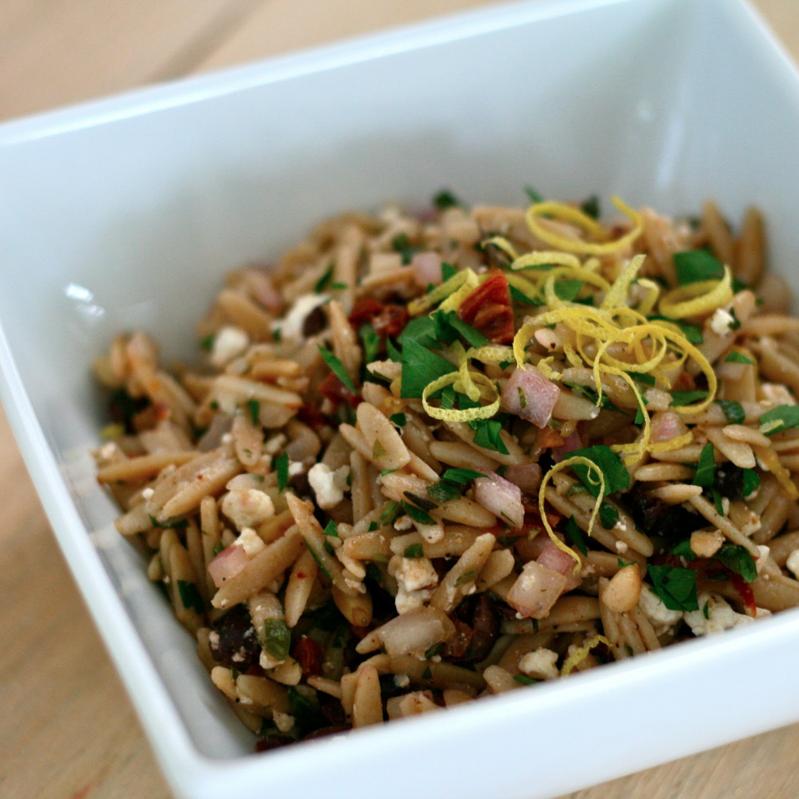 Orzo with Olives, Sun Dried Tomatoes, Feta & Pine Nuts