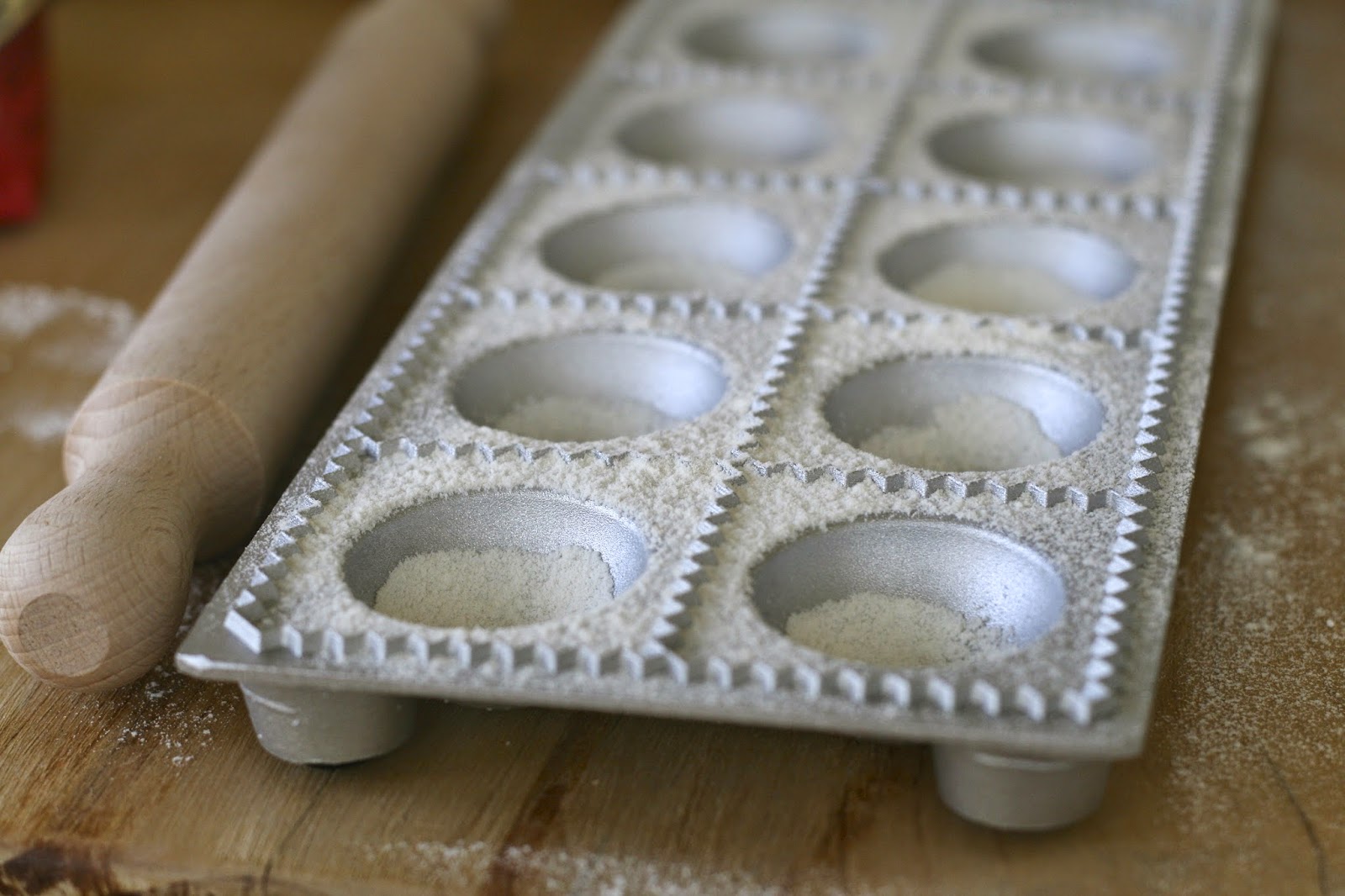 I used this particular ravioli mold, but you can totally do it free-hand if you’d like, or try individual ravioli stamps for bigger ravioli. If you are using a mold, be sure to sprinkle it with flour.